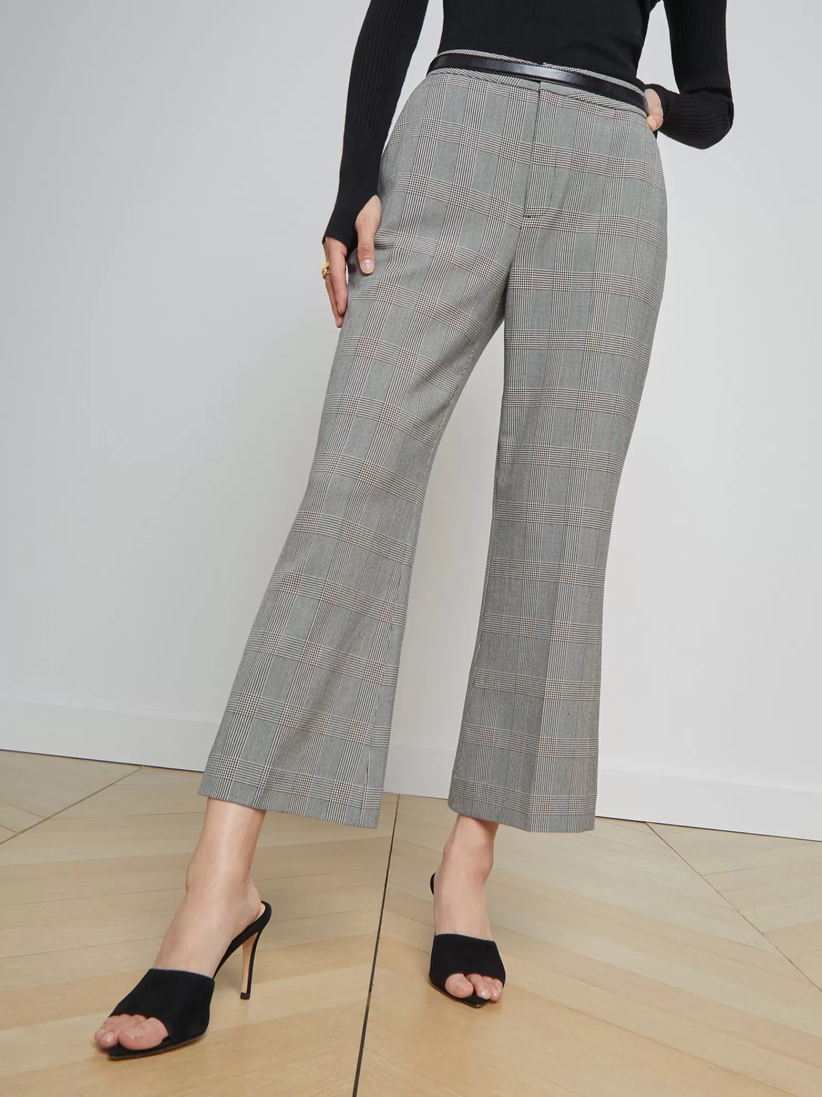A cropped flared-leg trouser in an ivory-and-black glen plaid. Trim-fitting style with slight stretch hugs from contoure…