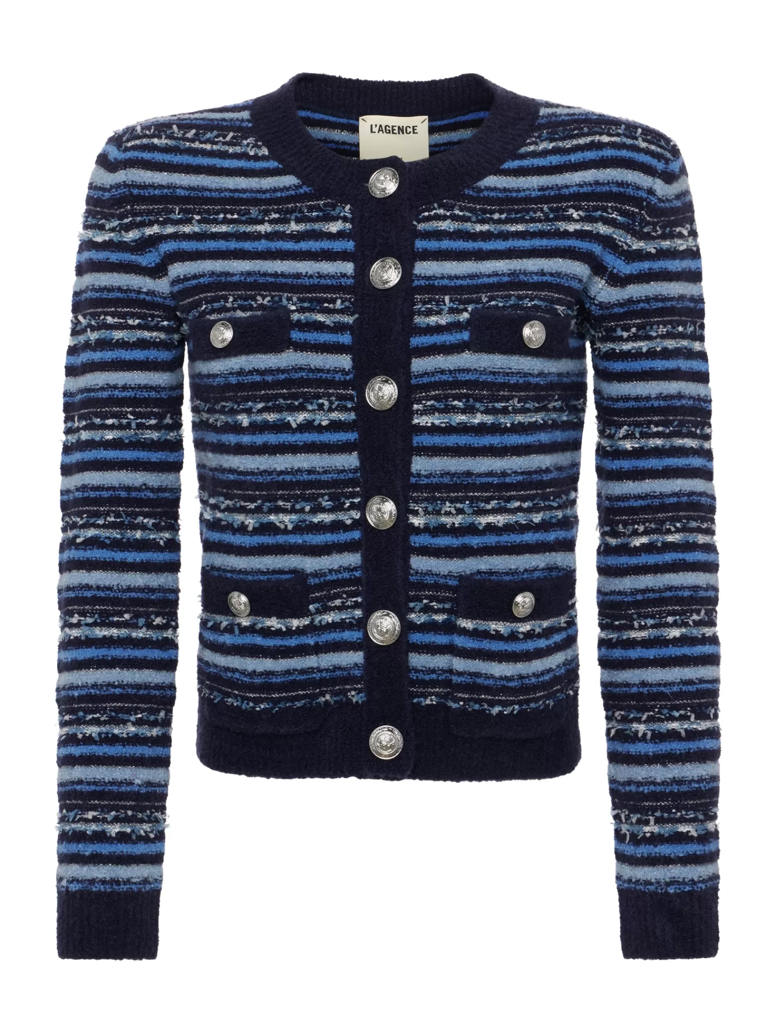 Polish, meet comfort. Our Woodson cardigan combines the best of both worlds, with strong shoulders, welt and patch pockets that lend the sophistication of a jacket. The felted striped knit has a soft handfeel and allows for complete freedom of movement. A touch of silver metallic and our signature embossed-dome buttons add a luxe element. Instantly dresses up denim. Pair with a sleek skirt and heels for sharp office style.