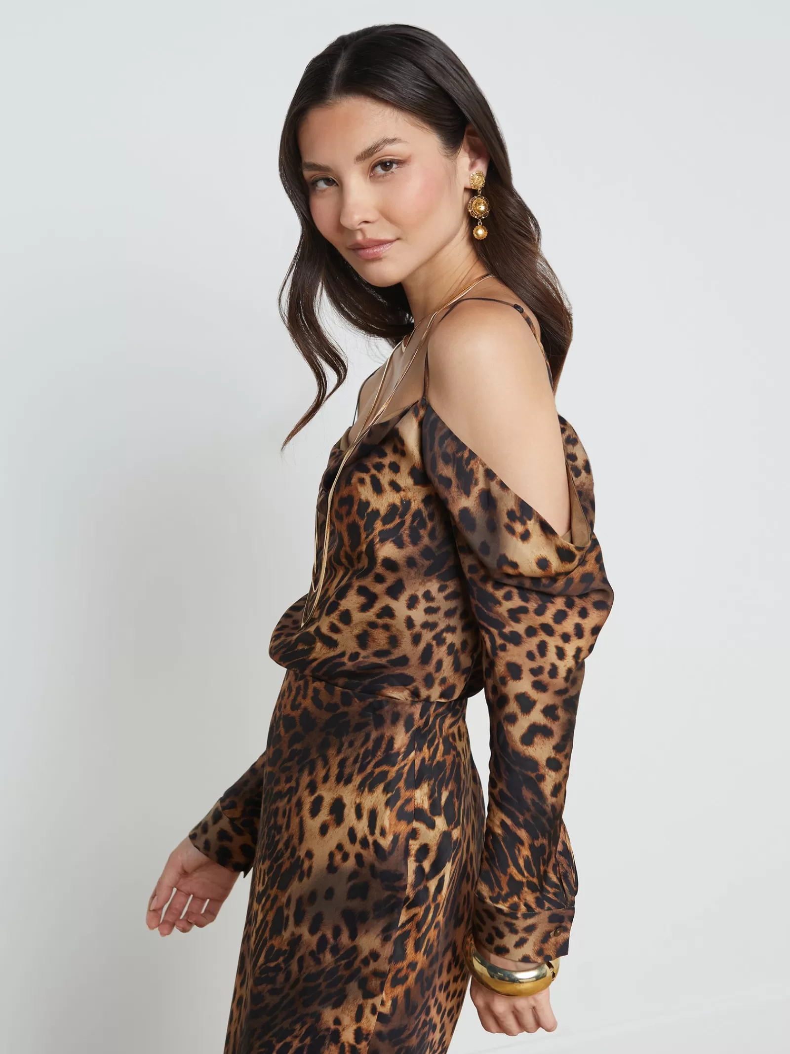 An exquisite off-the-shoulder blouse in leopard. Bias-cut silky style offers dramatic cowl-like drape at the front neckl…